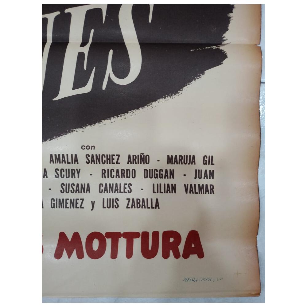 Mecha Ortiz: La dama del cine argentino El cartel destaca la presencia imponente de Mecha Ortiz, una de las actrices más icónicas y elegantes de la historia del cine en español. Junto a Francisco Martínez Allende y un reparto estelar que incluye a Amalia Sánchez Ariño, el afiche transmite esa "historia de amor y sacrificio" que promete el propio diseño. La ilustración, con su estética clásica y cuidada, es un ejemplo perfecto del arte publicitario de mediados del siglo XX.
