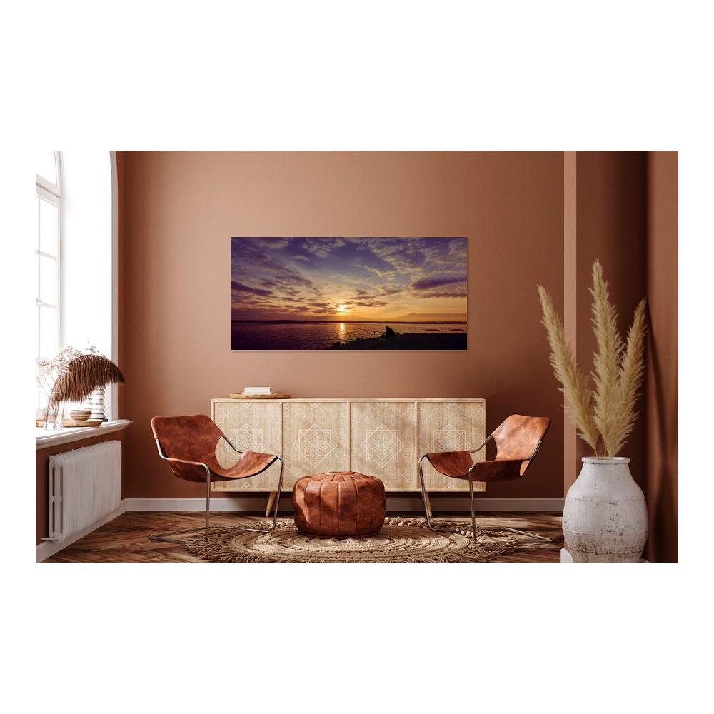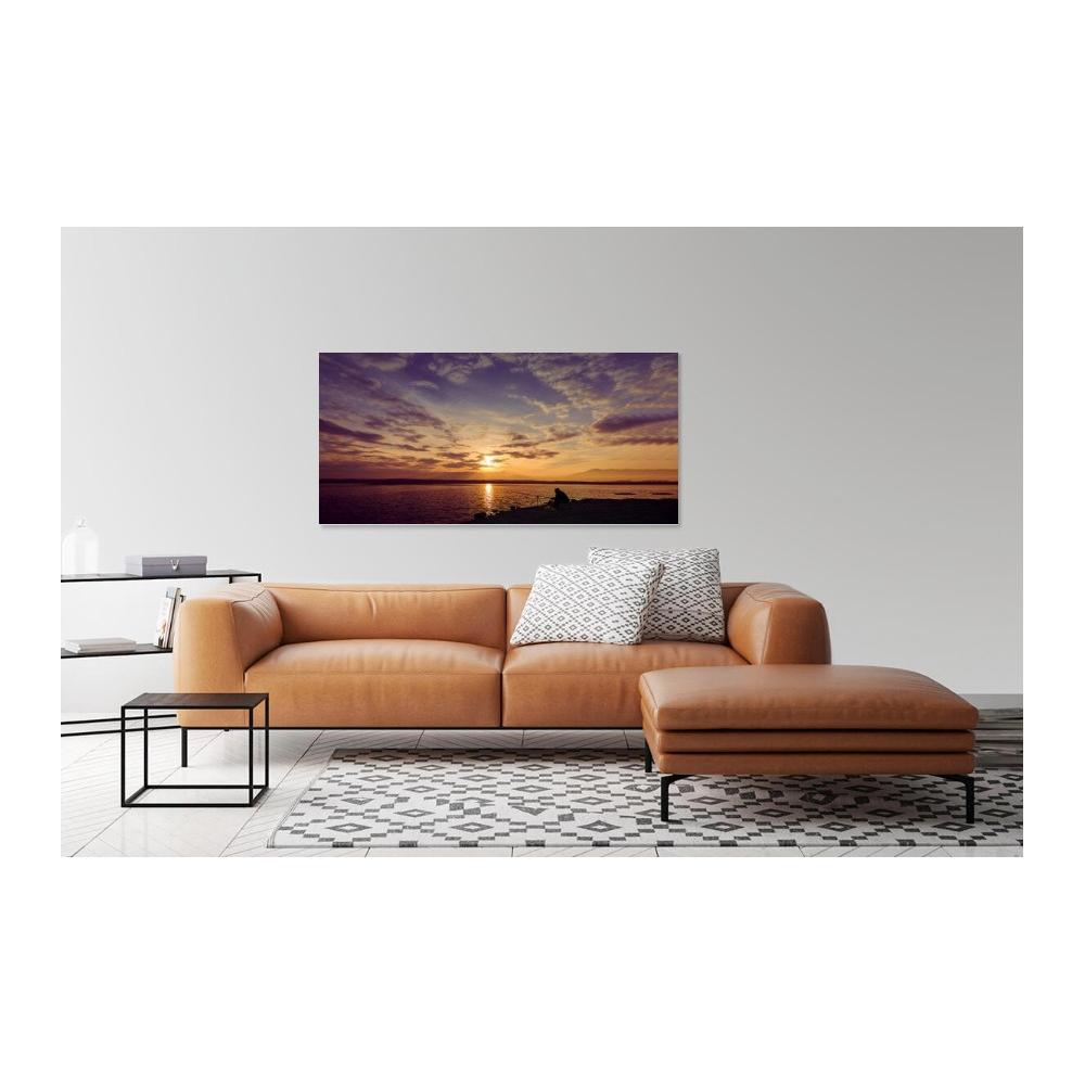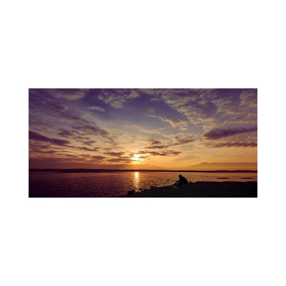 Captura un momento de calma y reflexión con esta evocadora imagen de un pescador disfrutando de los últimos rayos de sol. Los tonos dorados, naranjas y morados del cielo crean una atmósfera cautivadora que inspira paz y serenidad en cualquier estancia.