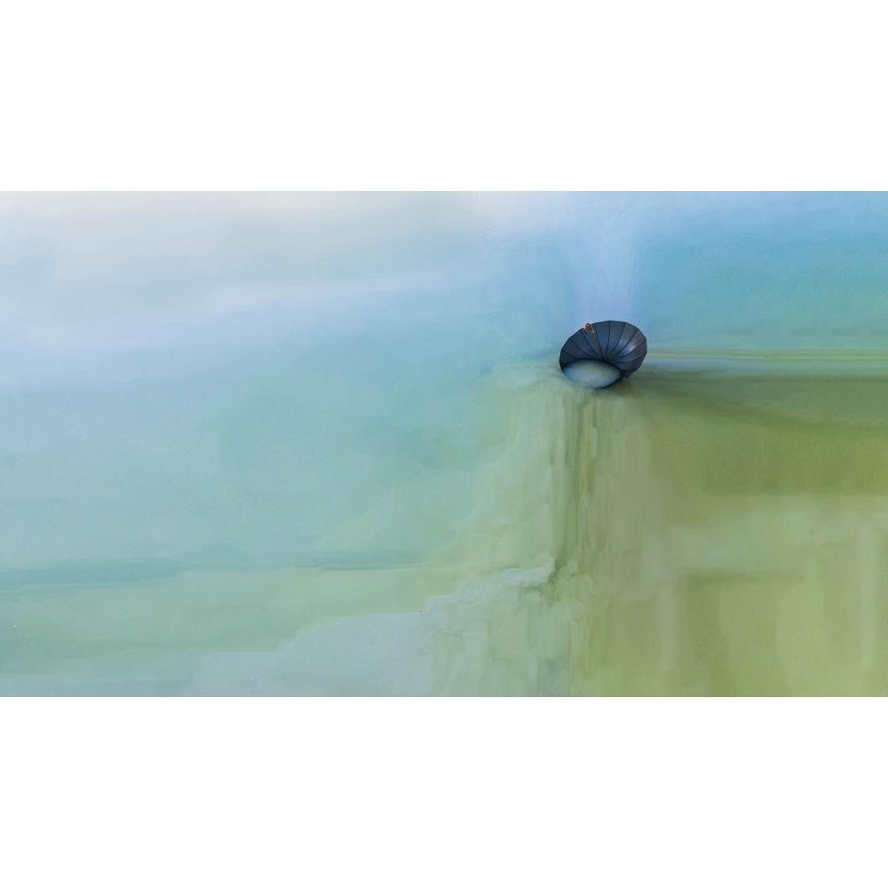Esta imagen tiene una atmósfera etérea y surrealista. La paleta de colores suaves, el espacio negativo y el paraguas solitario flotando como si fuera una pequeña barca en un mar de sueños evocan sensaciones de abandono, introspección y misterio.