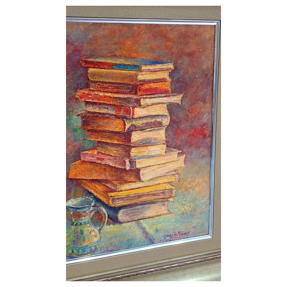 Esta cautivadora obra, un óleo sobre lienzo firmado por el artista García Miñana, es un bodegón que destila calidez y una atmósfera académica. La composición, dominada por pilas de libros antiguos, un globo terráqueo y una jarra de cristal, apela directamente a amantes de la literatura y coleccionistas de arte figurativo.