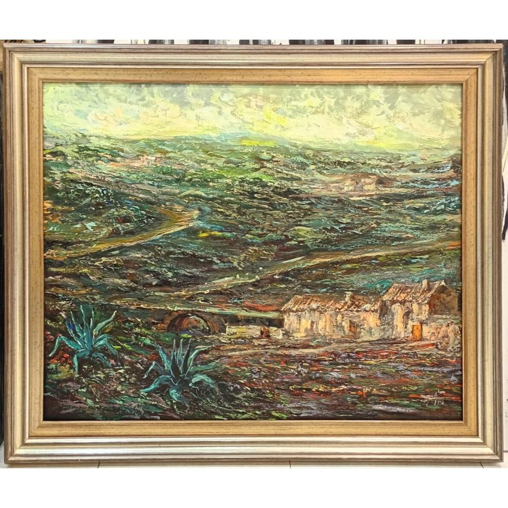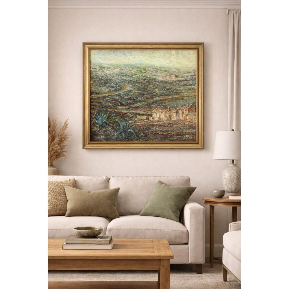 La composición es una celebración del paisajismo valenciano, resuelta con una energía y una técnica dibujística precisa que evocan la brisa y la intensidad del sol. El artista utiliza un empaste generoso y una paleta de verdes vibrantes y tonos terrosos para construir luces y sombras, sugiriendo rincones sin tiempo, casonas rurales mimetizadas en la naturaleza y la algarabía floral de la geografía española.