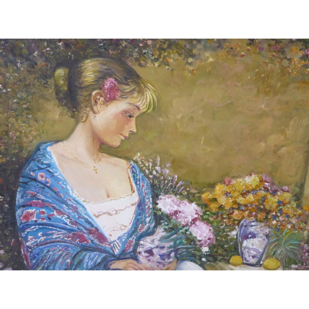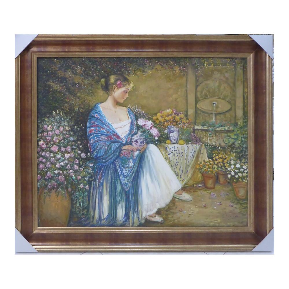Este exquisito óleo sobre lienzo captura un momento de tranquila introspección en un exuberante jardín mediterráneo, en un estilo que recuerda al impresionismo y al figurativismo español.