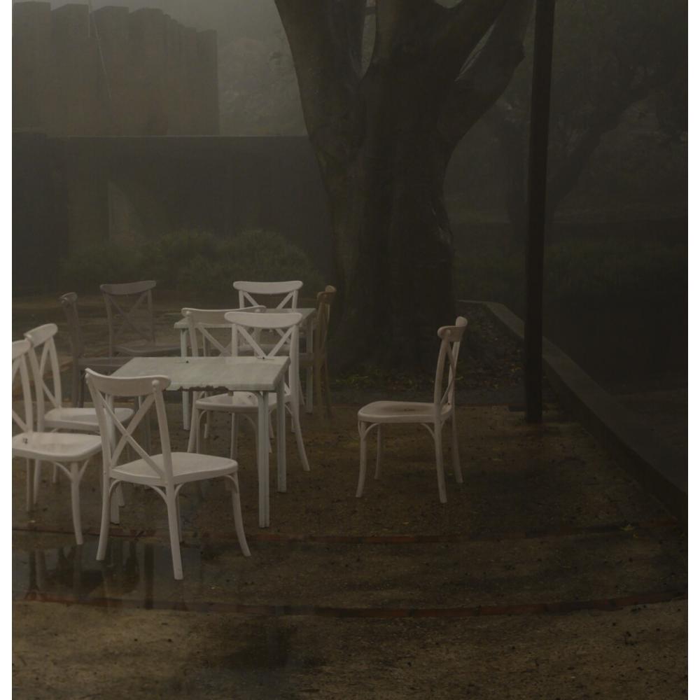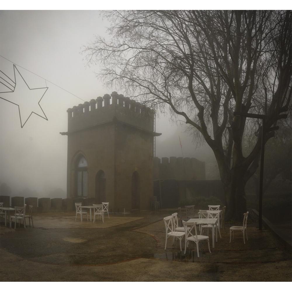 Sumérgete en la atmósfera etérea de esta cautivadora fotografía, donde la niebla envuelve un edificio de aspecto fortificado con una gran estrella colgante. La paleta de colores apagados y la bruma crean una sensación de misterio y tranquilidad, perfecta para añadir un toque artístico y evocador a cualquier espacio. Es un lugar real en España que cuenta con un restaurante y áreas de pícnic para los visitantes.