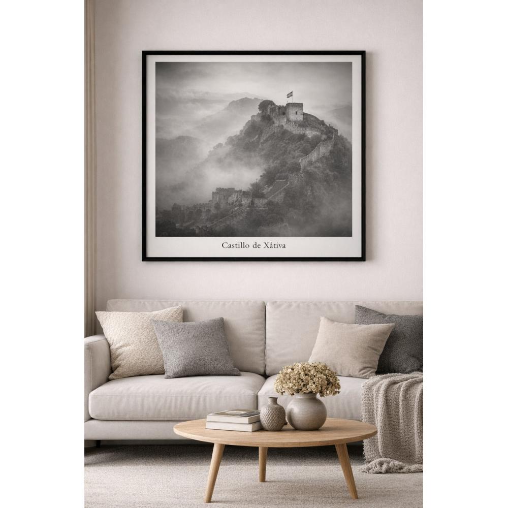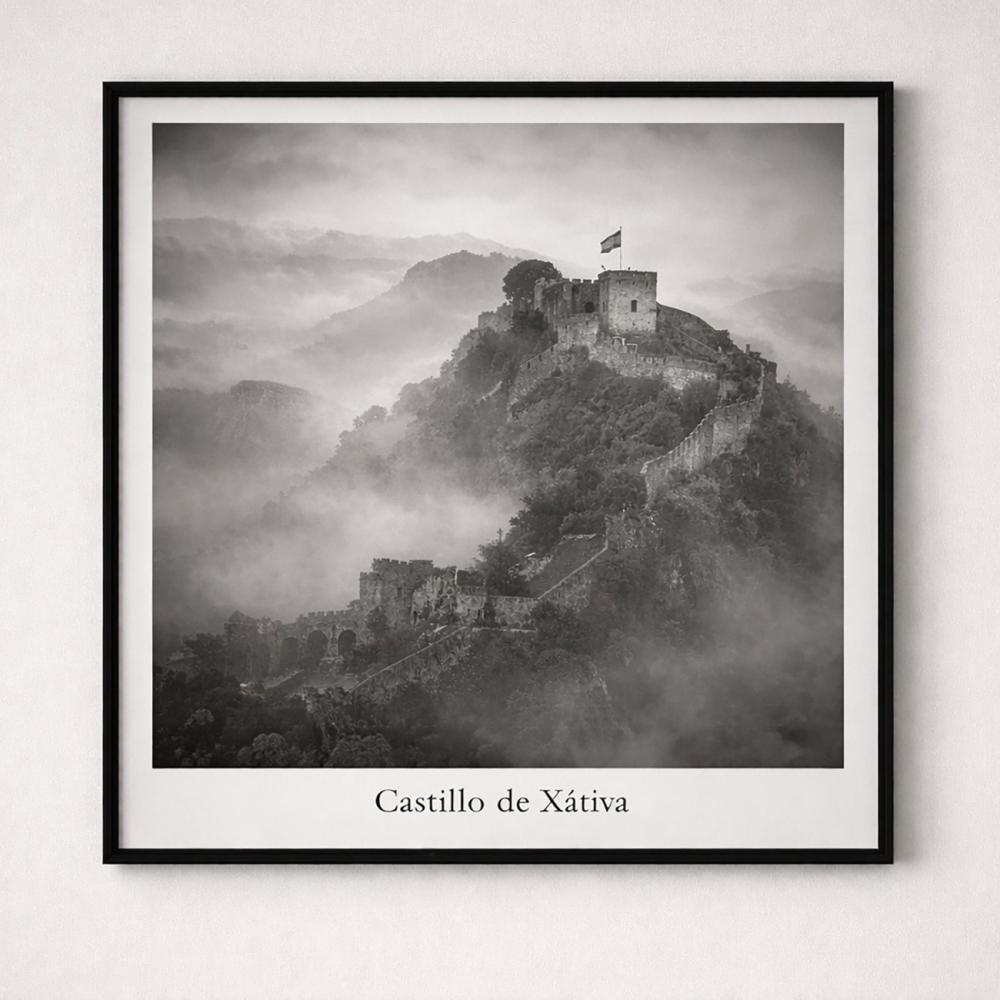 "Guardianes de la Bruma" captura la imponente silueta del Castillo de Xàtiva emergiendo entre una atmósfera etérea de niebla. Esta fotografía artística en blanco y negro no es solo una imagen, es una ventana al pasado que aporta una profundidad visual inigualable a cualquier espacio contemporáneo o clásico.