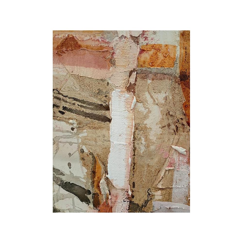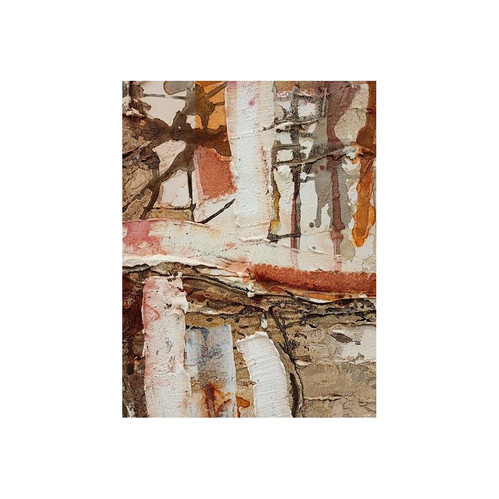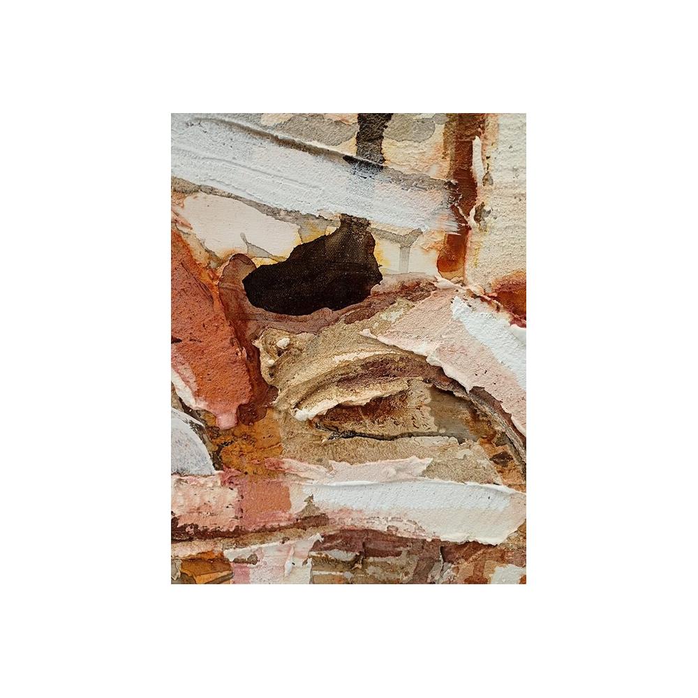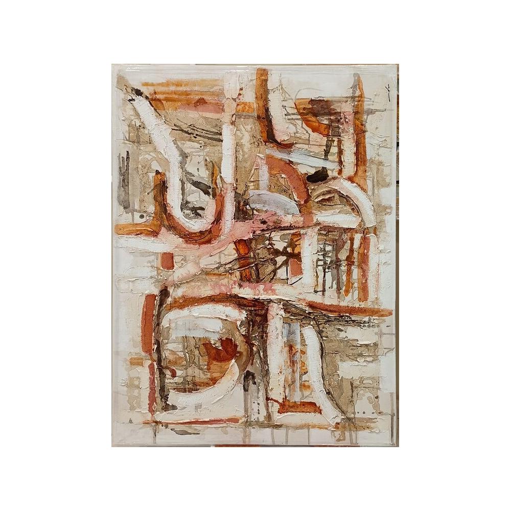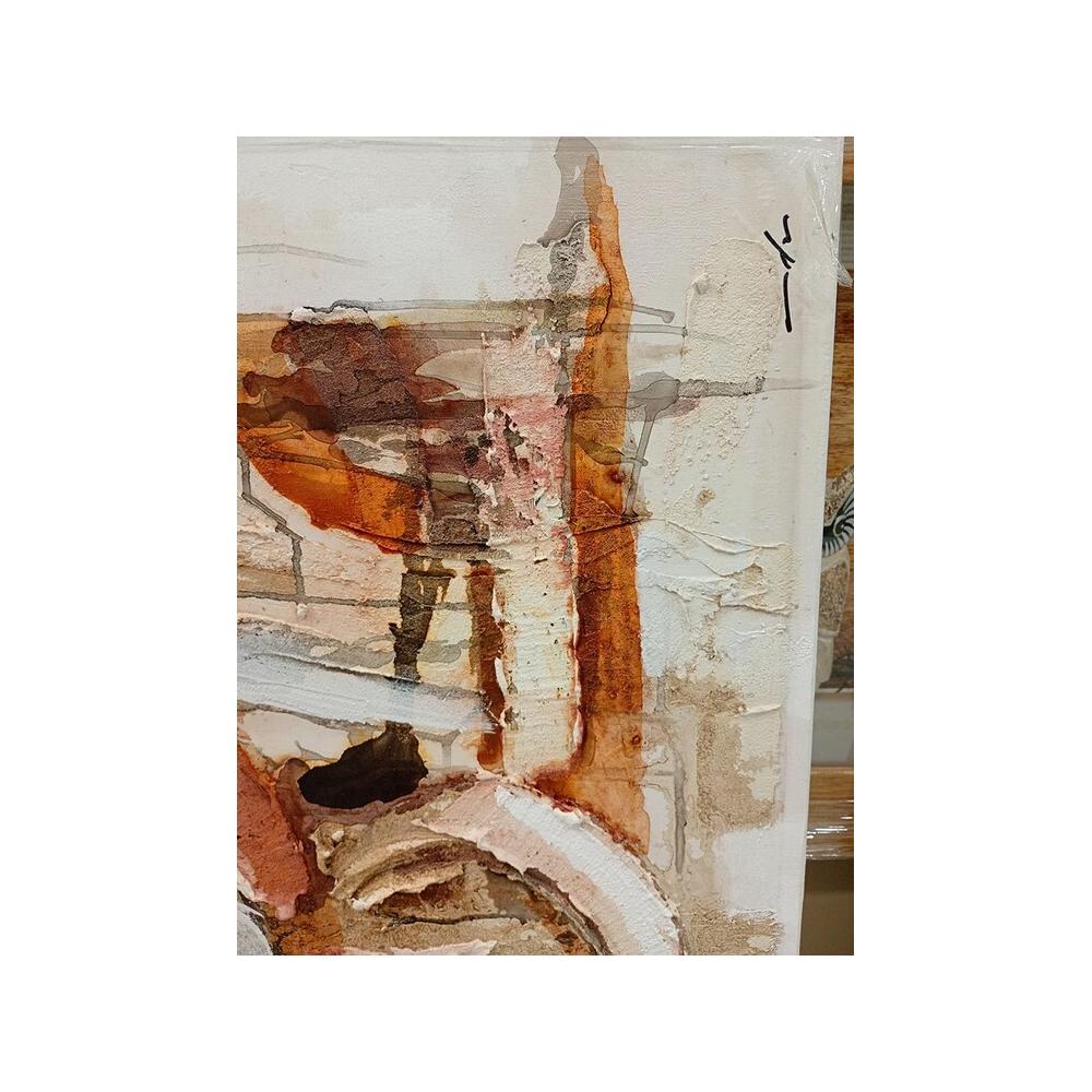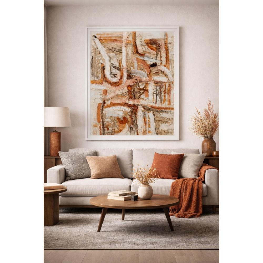 Esta pintura destaca por su estilo abstracto y contemporáneo, donde la técnica del acrílico sobre lienzo se emplea para crear un acabado visual de gran impacto. Los colores dominantes son tonos cálidos y terrosos (ocres, naranjas, marrones), equilibrados por el blanco y toques de gris, generando una paleta sofisticada y versátil.
