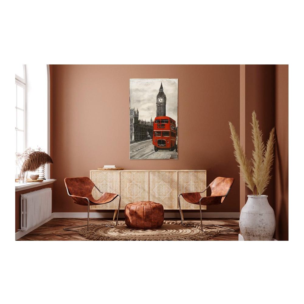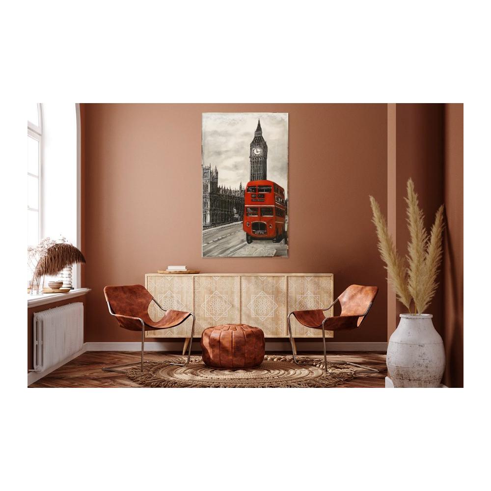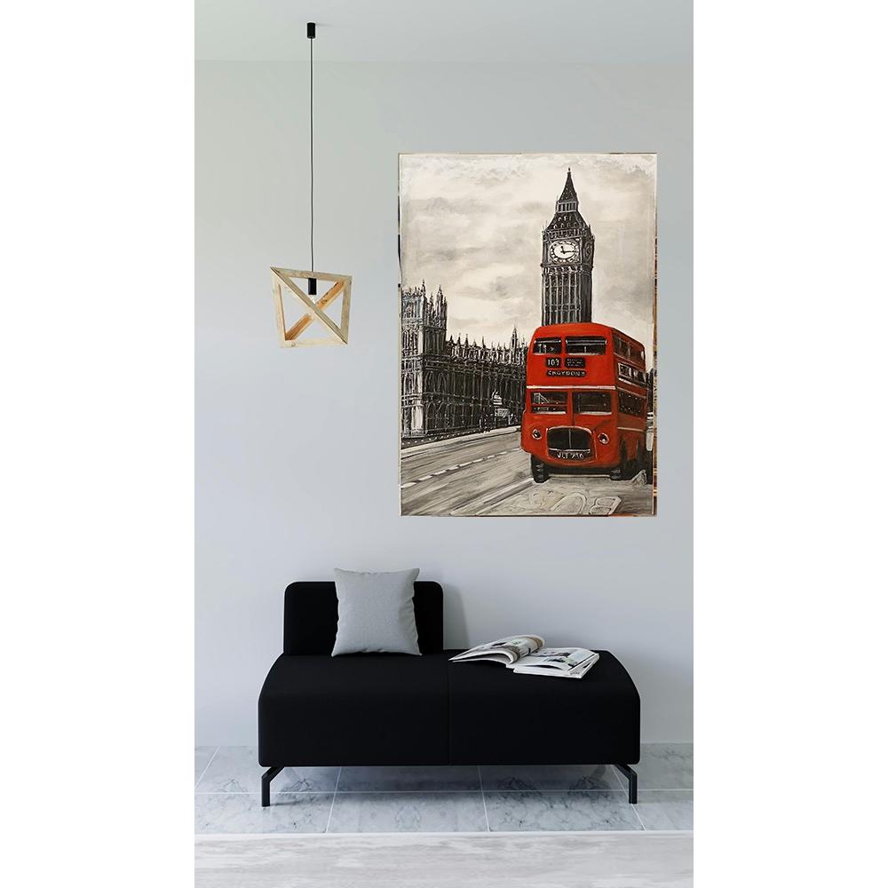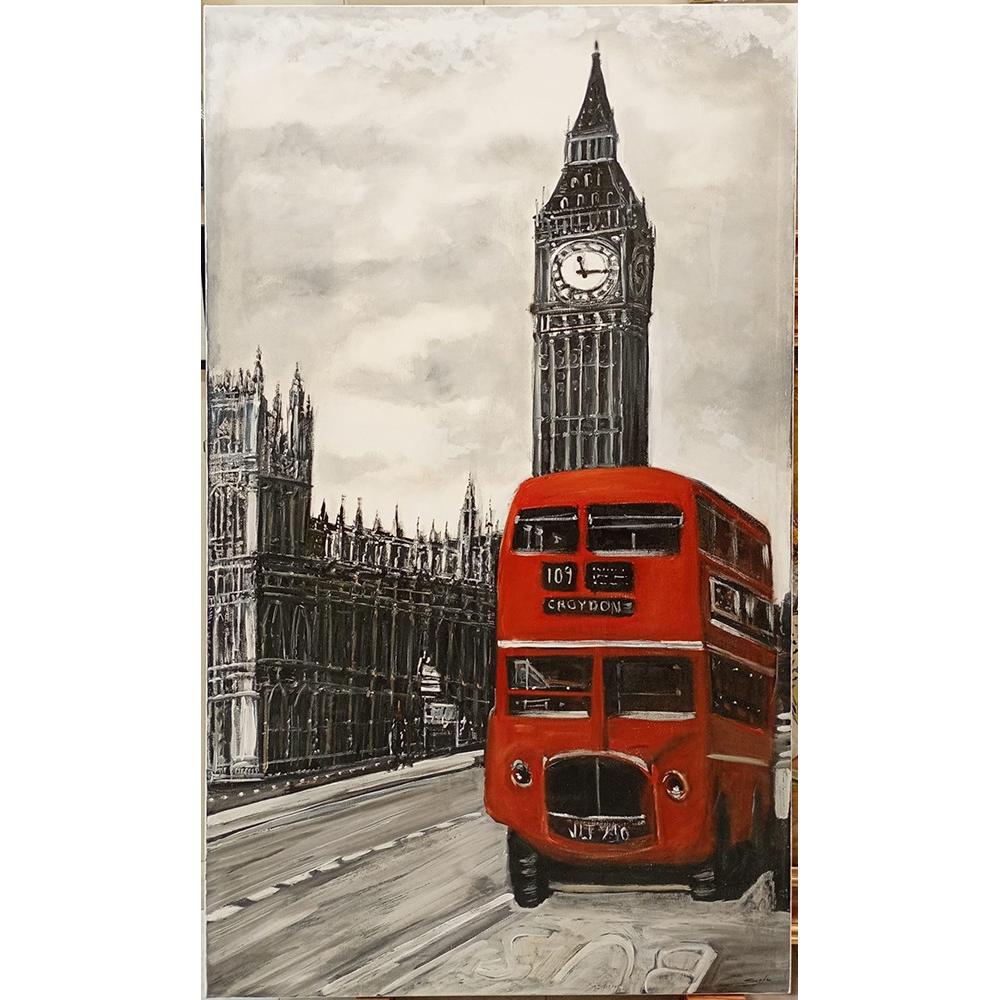 Esta pintura destaca por su estilo figurativo con un toque expresionista, capturando un momento vibrante de Londres. La técnica de acrílico sobre lienzo se utiliza magistralmente para crear un impactante contraste visual: la ciudad histórica se representa en una elegante escala de grises, mientras que el icónico autobús rojo estalla en un color vivo y audaz.