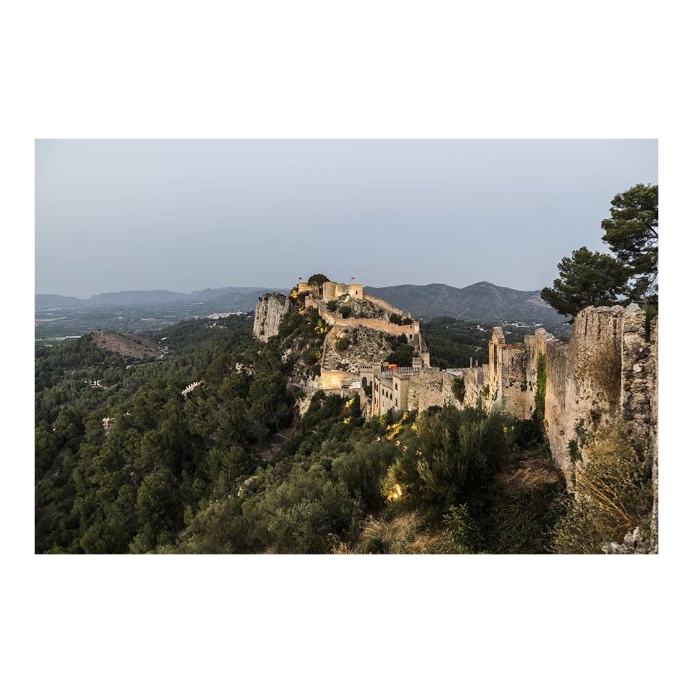 Lleve a su hogar un símbolo de la historia y el poder con esta fotografía de las murallas del Castillo de Xàtiva. La imagen ofrece una perspectiva impresionante de las murallas iluminadas, integrándose perfectamente en el accidentado relieve de la Sierra de Vernisa.