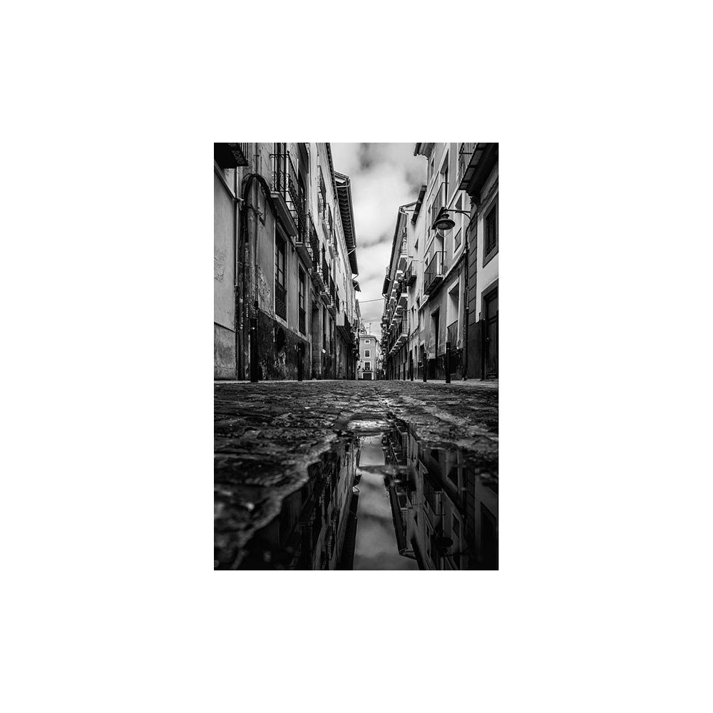 Una mirada poética a la historia de Xàtiva. Esta fotografía en blanco y negro captura el reflejo de la Calle Corretgeria sobre el pavimento mojado, creando una simetría perfecta que resalta la arquitectura tradicional de la ciudad.
