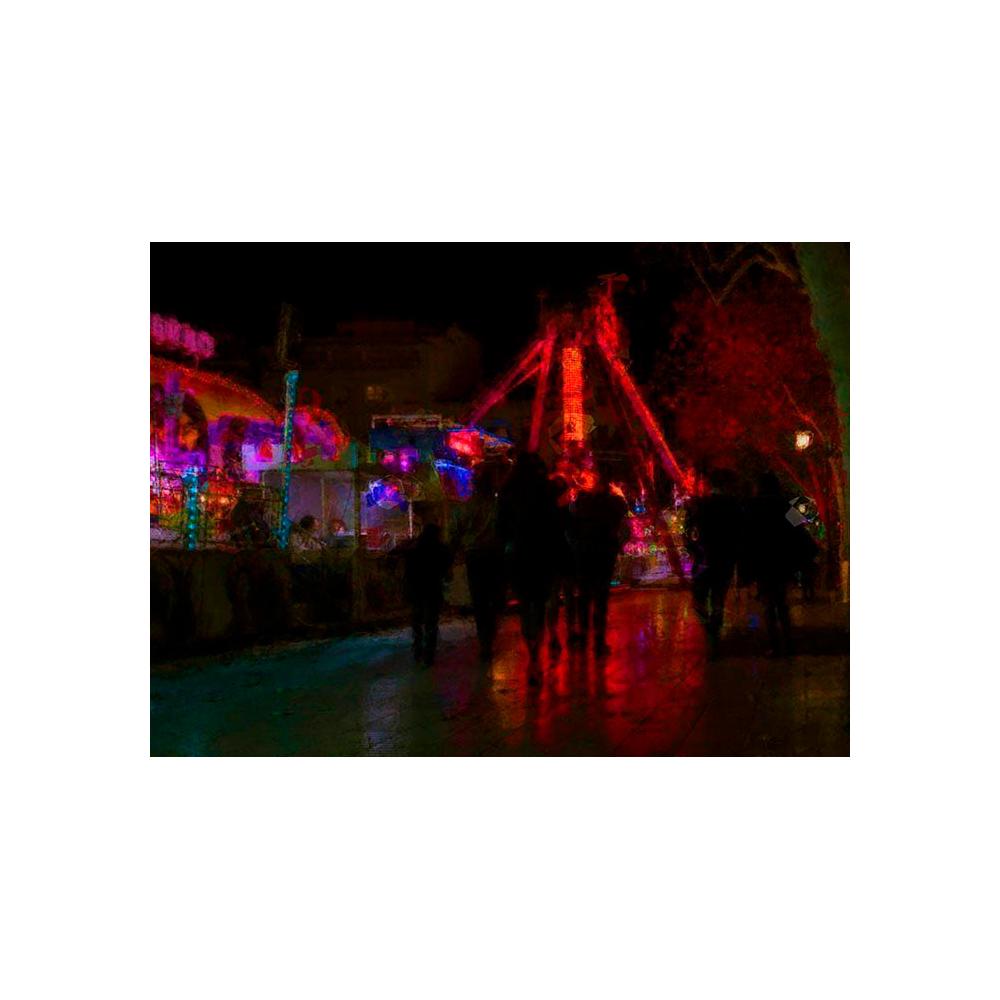 Impactante fotografía de feria nocturna (70x51 cm) con gran riqueza de color y movimiento. Perfecta para añadir un toque dinámico a tu decoración. Disponible en stock. Consulta nuestras opciones para enmarcar cuadros de forma personalizada en nuestro taller de Xàtiva.