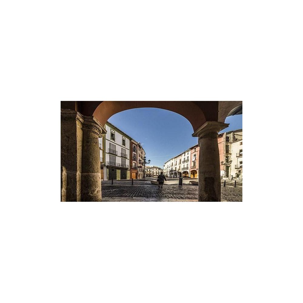 Arquitectura e Historia Bajo el Sol Mediterráneo Esta fotografía artística captura la esencia histórica de la Plaza del Mercado de Xàtiva a través de una cuidada composición de "encuadre natural". Utilizando un arco de piedra en primer plano para enmarcar la escena, la imagen invita al espectador a adentrarse en la luminosidad de la plaza. La paleta cromática destaca por la calidez de los tonos piedra y los blancos de las fachadas, que contrastan armoniosamente con un cielo azul profundo y despejado, evocando la serenidad de una mañana mediterránea.