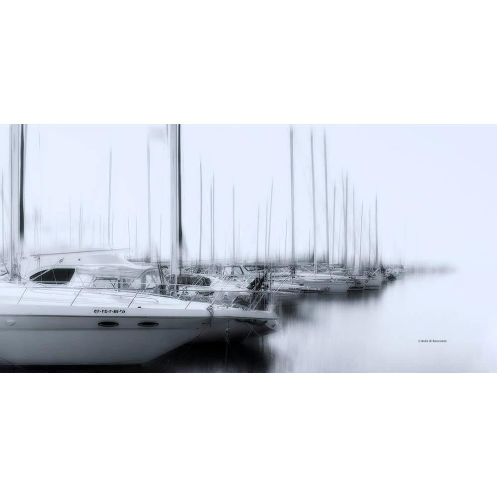 Esta imagen panorámica destaca por su tratamiento visual suave, casi etéreo, que difumina las líneas de los mástiles creando una atmósfera de paz absoluta. Su formato de 50 x 100 cm la convierte en la pieza ideal para presidir cabeceros de cama, sofás o despachos que busquen un toque de distinción minimalista.