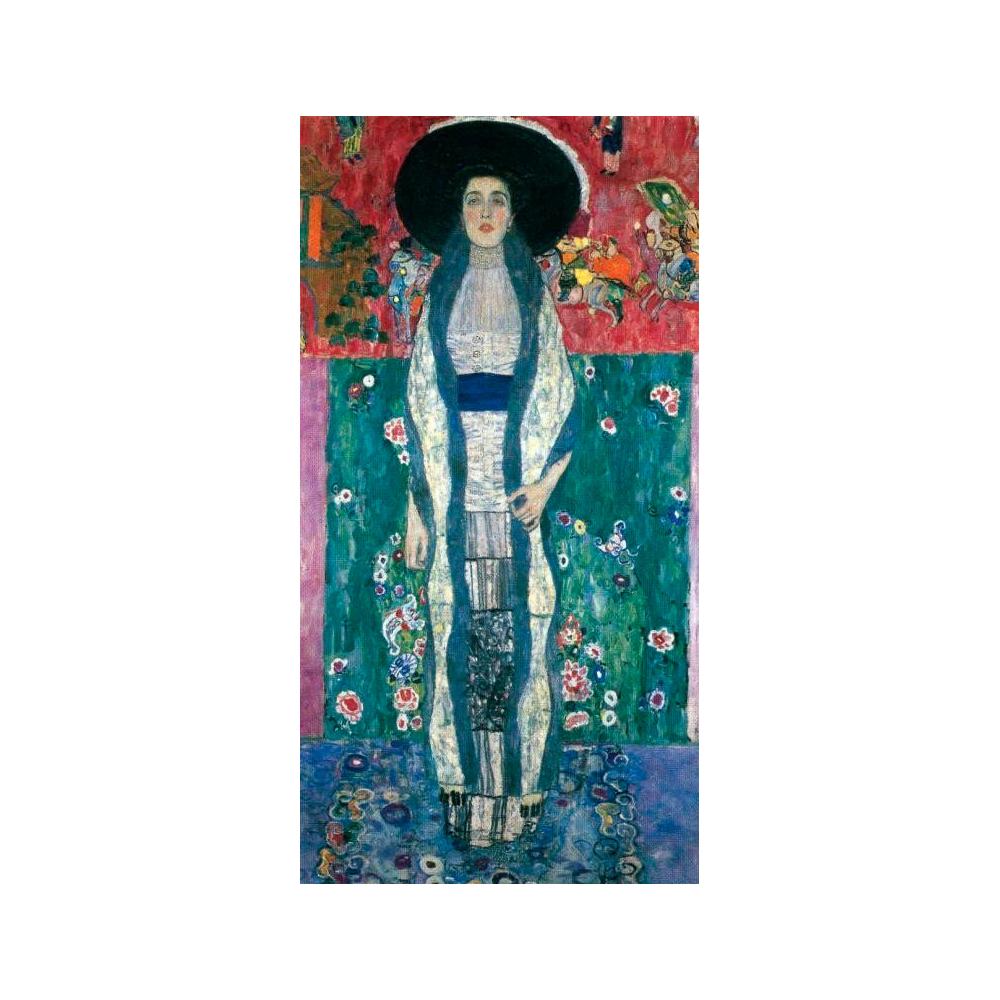 Esta lámina reproduce fielmente el segundo retrato que Gustav Klimt realizó de su musa, Adele Bloch-Bauer. A diferencia de su etapa dorada, esta obra destaca por el uso vibrante de tonos joyas y patrones florales, situando a la figura en un entorno decorativo casi onírico.