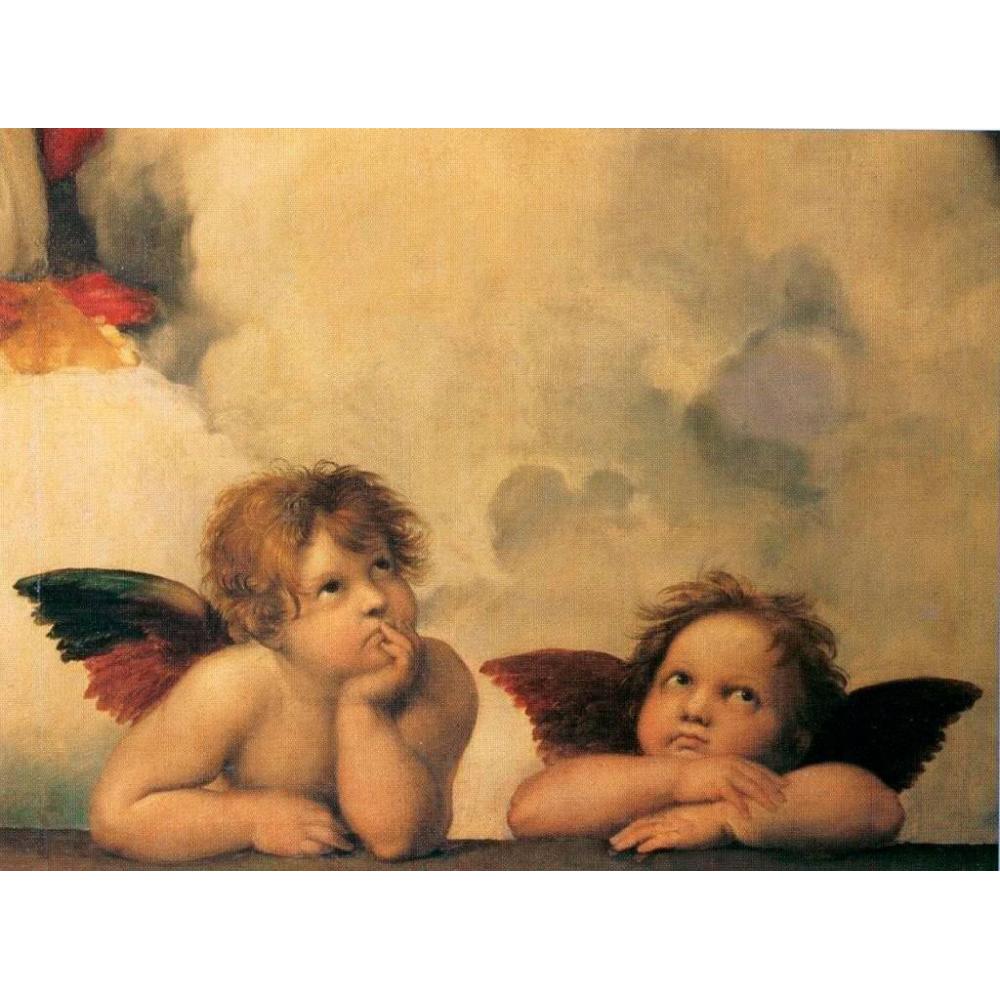 Esta lámina captura el detalle más célebre de la Madona Sixtina, pintada por el maestro renacentista Rafael Sanzio hacia 1512. Los dos querubines, con su expresión pensativa y relajada, se han convertido en un icono independiente de la belleza y la armonía artística.