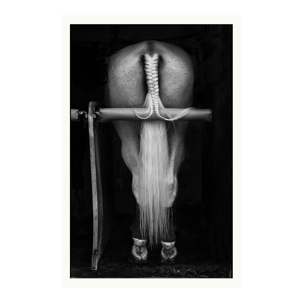 Añada una dosis de sofisticación y fuerza a su decoración con esta fotografía artística de un caballo en blanco y negro. La imagen destaca por su impecable juego de luces y sombras, centrando la atención en la delicada textura de la crin trenzada y la potencia de la figura animal.