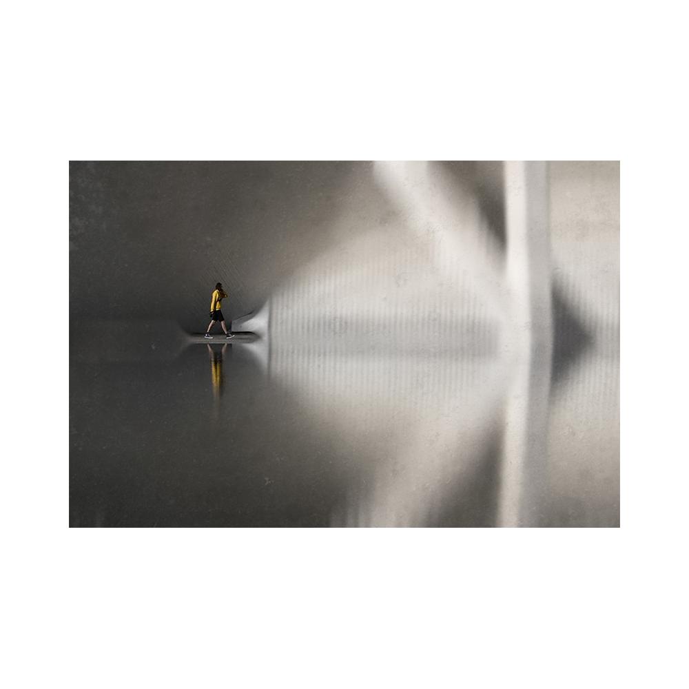 Una obra de fotografía contemporánea que juega con la geometría, los reflejos y la soledad del caminante. Impresa en papel fotográfico de alta gama, es la pieza perfecta para ambientes minimalistas y vanguardistas.
